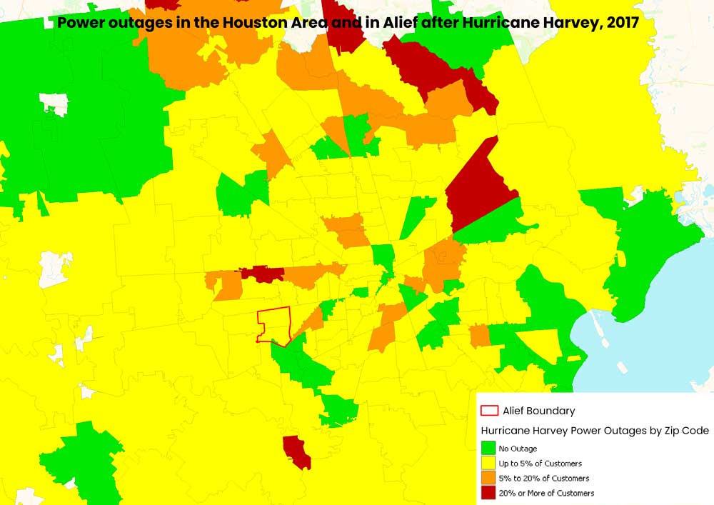 As many as 45,000 homes experienced power outages in the aftermath of Hurricane Harvey in 2017.Estimates for future flood risk predict that 77% of homes have a greater than 26% chance of being severely affected by flooding in the next 30 years, according to First Street.